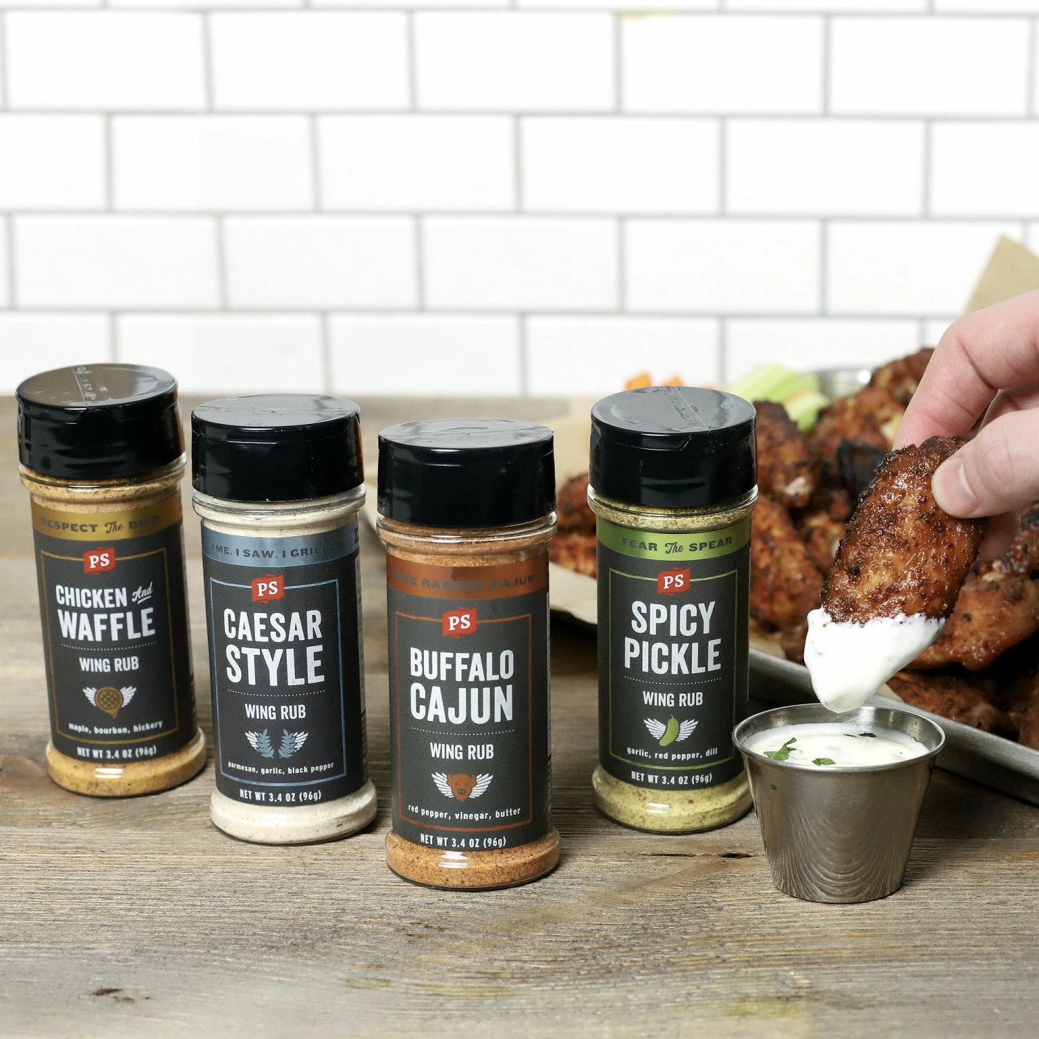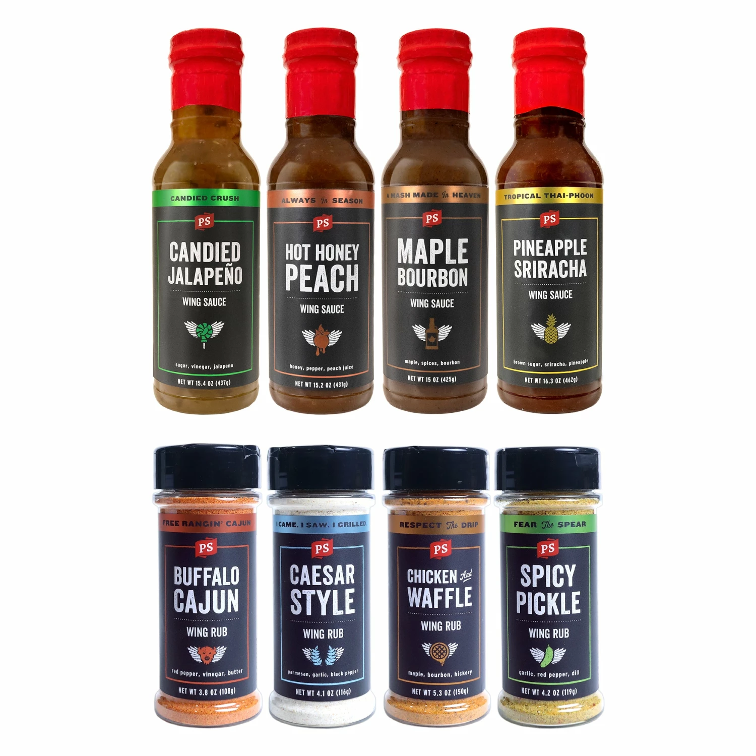 The ultimate way to experience the wingdom. Enjoy endless possibilities with one perfect package that includes everything you need to explore this world of wings. The set includes all four of our gourmet wing rubs and four wing sauces.Â